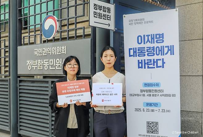 한편 세이브더칠드런은 지난 7월 8일 아동 기본소득 도입, 영유아 가정방문 서비스 의무화, 영유아 발달 지원 서비스 전국 확대, 보편적 출생 등록제도 도입, 아동기본법 제정, 디지털 환경에서의 아동 보호, 전문상담교사 법정 배치 기준 마련, 아동사망검토제도 도입 등 8가지 정책 과제를 국정기획위원회에 제안한 바 있다.