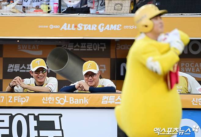 (엑스포츠뉴스 대전, 박지영 기자) 12일 오후 대전 한화생명볼파크에서 열린 '2025 신한 SOL Bank KBO 올스타전' 드림 올스타와 나눔 올스타의 경기, 나눔 염경엽 감독과 김경문 감독이 문현빈의 꿈돌이 퍼포먼스를 바라보며 웃고 있다.