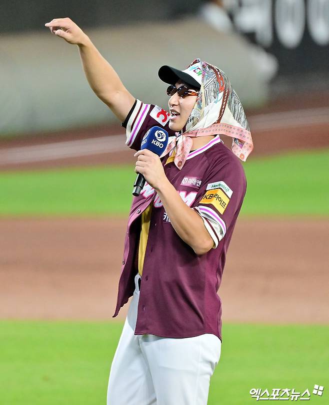 (엑스포츠뉴스 대전, 김한준 기자) 12일 오후 대전한화생명볼파크에서 열린 '2025 신한 SOL Bank KBO 올스타전' 드림 올스타와 나눔 올스타의 경기, 나눔 올스타 주승우가 마운드로 향하며 노래를 부르고 있다.