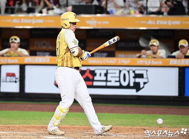 (엑스포츠뉴스 대전, 박지영 기자) 12일 오후 대전 한화생명볼파크에서 열린 '2025 신한 SOL Bank KBO 올스타전' 드림 올스타와 나눔 올스타의 경기, 6회말 나눔 선두타자 문현빈이 사구에 맞고 있다.