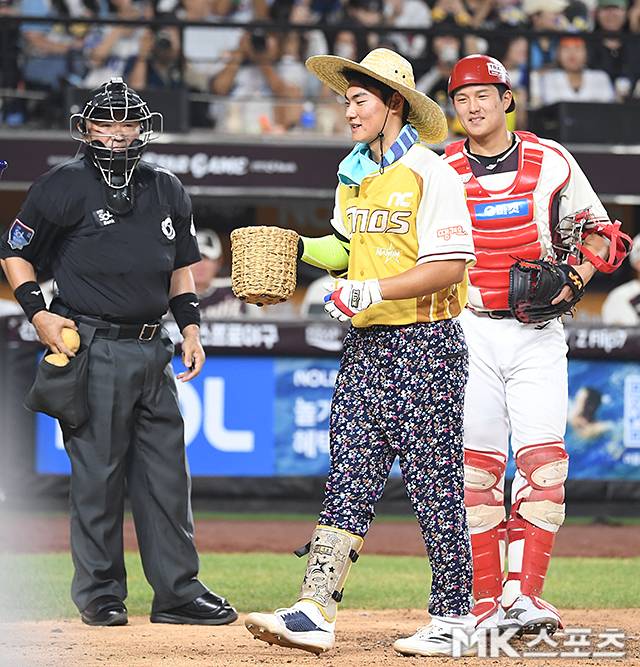 7회 김주원이 타석에 들어서며 퍼포먼스를 선보이고 있다.
