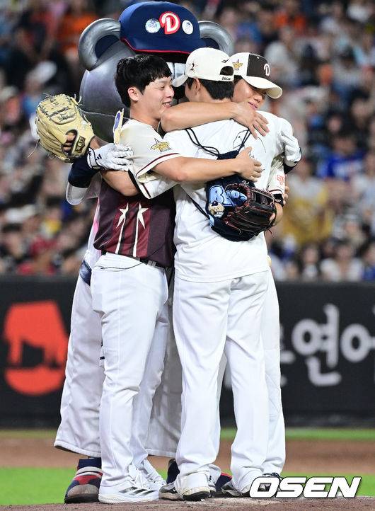 7회말 마운드에 오른 드림 올스타 두산 김택연이 박치국-오명진과 포옹하고 있다. 2025.07.12 / dreamer@osen.co.kr