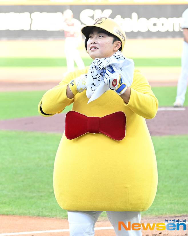 1회말 공격에 나선 나눔 타자들의 퍼포먼스도 남달랐다. 리드오프로 나선 문현빈은 '대전의 아들'답게 '꿈돌이' 인형 옷을 입고 타석에 들어서 안타를 기록했다. 지난해 '키스 성문'으로 충격적인 모습을 선보였던 송성문은 이번에는 '세일러 문'이 돼 등장했다. 류지혁은 사자 인형옷을 입은 막내딸을 높이 들어올리는 '라이언 킹의 탄생' 퍼포먼스로 아이와 함께 즐거운 장면을 연출했다.