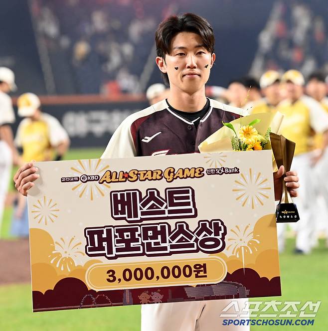 12일 대전 한화생명볼파크에서 열린 2025 KBO 올스타전, 베스트 퍼포먼스상을 수상한 전민재가 트로피를 받고 있다. 대전=허상욱 기자wook@sportschosun.com/2025.07.12/