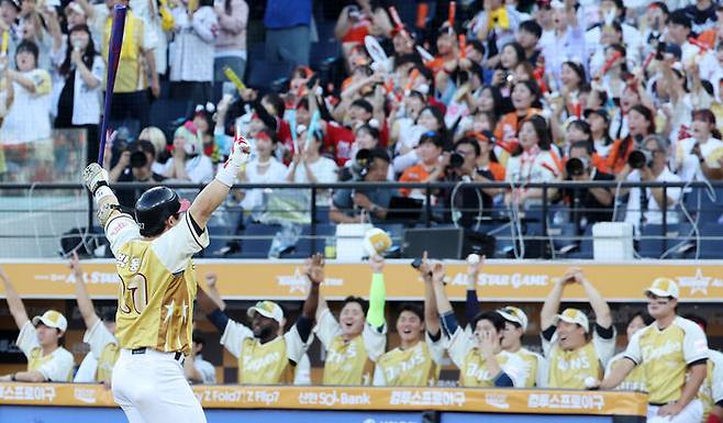 ▲ 12일 대전 한화생명 볼파크에서 열린 2025 신한 SOL뱅크 KBO 올스타전. 1회말 2사 2루 때 나눔 올스타 박동원이 2점 홈런을 친 뒤 환호하고 있다.
