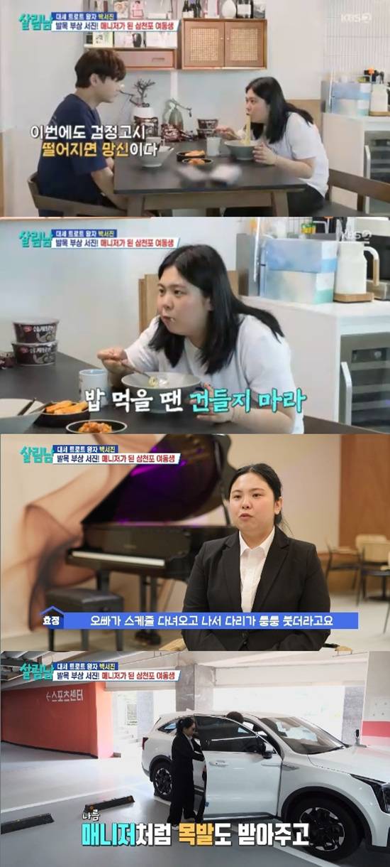 발목부상으로 목발을 짚고 있는 박서진은 동생의 케어를 거부했다. 박효정은 어떻게든 오빠를 도와주려고 했다.