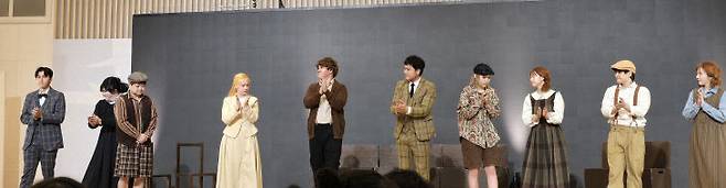 뮤지컬 시카고의 아이들 주연배우들이 공연을 마친 후 관객들에게 인사하고 있다. 드와이트 무디 역을 맡은 주인공 배우가 감사인사를 하고 있다.