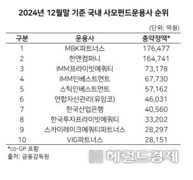 금감원이 이달 초 발표한 '기관전용 사모집합투자기구 현황'에 따르면 2024년 12월말 기준 10조 이상을 운용하는 GP는 MBK파트너스, 한앤컴퍼니 등 두 곳에 불과했으며 5조원 이상을 운용하는 곳은 IMM PE, IMM인베스트먼트를 비롯해 스틱인베스트먼트 등 5개사다.