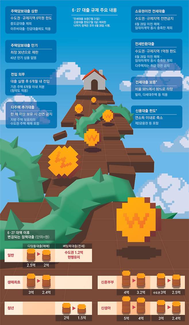 6·27 대책에는 여러 정책대출을 축소하는 방안도 포함됐다. 가장 먼저 수도권에선 생애최초 주택담보대출비율(LTV)이 80%에서 70%로 낮아졌다. 그동안 정부는 태어나서 처음으로 집을 사는 사람들은 실수요자로 보고 LTV 규제를 좀 풀어주고 있었다. 만일 생애 최초로 8억원짜리 아파트를 사는 사람이 있을 경우 기존엔 최대 6억4000만원(LTV 80%)까지 주담대가 나왔지만 이젠 5억6000만원(LTV 70%)만 빌릴 수 있다는 뜻이다.