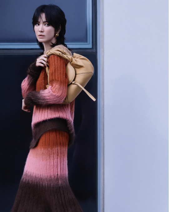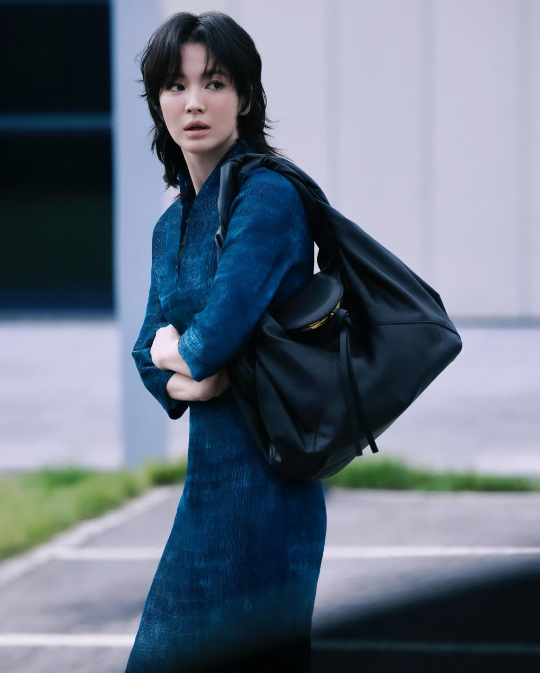 반면 또 다른 컷에서는 시선을 아래로 떨어뜨린 채 짙은 블루 드레스를 입은 송혜교가 등장했다. 얇은 플리츠 텍스처와 짙은 색감은 무게를 더했고, 블랙 레더 백이 그녀의 어깨를 덮었다. 이때 송혜교는 카메라를 외면했고, 손끝에는 묘한 긴장이 서려 있었다.