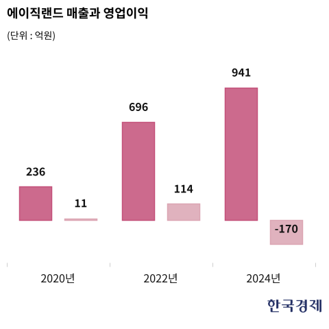 에이직랜드는 몸집을 불리고 있다. 2020년 매출 236억원에서 작년 941억원으로 4년 만에 4배 증가했다. 영업이익은 2022년 114억원으로 사상 최대를 기록했지만 작년 170억원의 손실을 냈다. 그 이유를 묻자 “반도체 디자인 하우스는 우수 인력이 중요하다”며 “작년 신규 인력을 100명 넘게 채용했고 신사옥 이전(2024년 4월)과 업계 간 경쟁 치열로 빨간불이 켜졌다”고 해명했다. 고연봉인 엔지니어 비중이 높고 반도체 업황 둔화로 올해도 적자가 불가피해 보인다. 1분기엔 매출 157억원, 영업손실 79억원의 성적표를 제출했다.