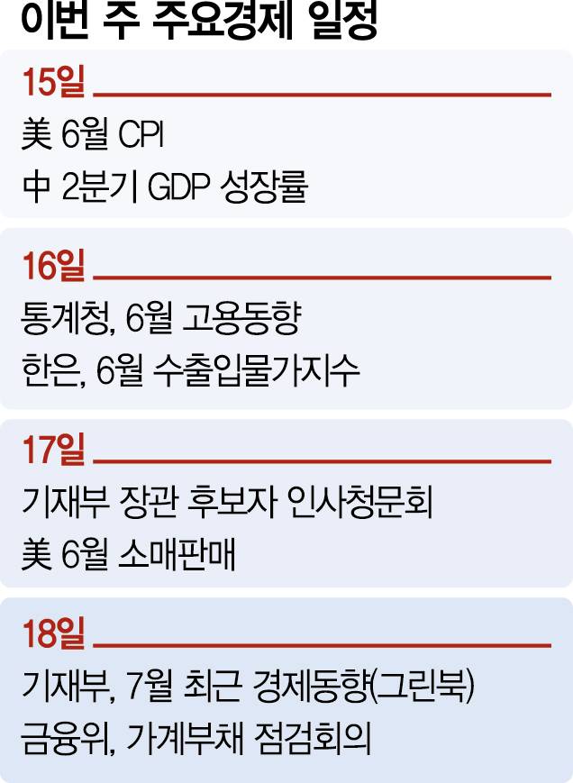 해외에서는 미국과 중국의 경제지표에 이목이 쏠린다. 미국에서는 2분기 어닝시즌이 시작되며 6월 소비자물가 상승률(CPI), 소매판매가 발표된다. 미국 연방준비제도(Fed·연준) 위원들 사이에서 추가 금리 인하 시기를 두고 의견들이 엇갈리고 있는 만큼 물가지표가 최대 관심사다. 6월 CPI 상승률 시장 전망치는 2.6%로 5월(2.4%)보다 상승할 것으로 예상된다.