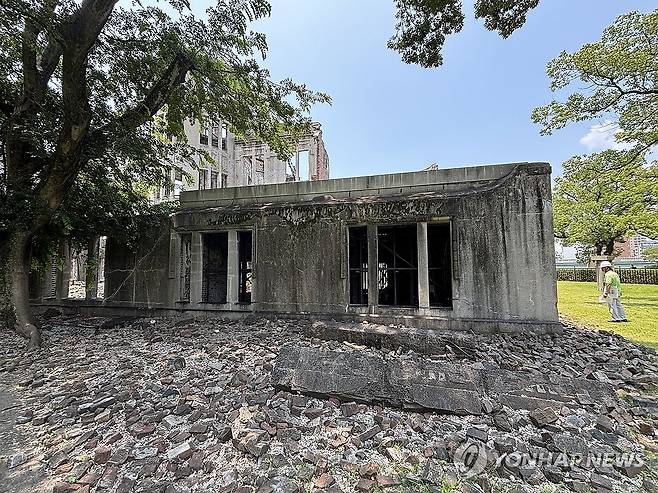 (히로시마=연합뉴스) 박상현 특파원 = 1945년 8월 6일 미국이 일본 히로시마에 원자폭탄을 투하했을 때 파괴된 '원폭돔'에 당시 잔해가 남아 있다. 이 건물은 1915년 지어져 히로시마현 산업장려관으로 활용됐다. 원폭 투하 지점과는 160m 떨어져 있으며 유네스코 세계유산으로 등재됐다. 올해는 히로시마와 나가사키에 원자폭탄이 투하된 지 80년이 되는 해다. 사진은 지난 8일 모습. 2025.7.13