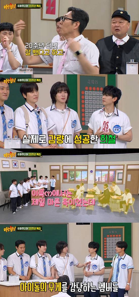김영철이 "20주년 되면 (김희철이) 살 뺀다고 했다"라고 말하자, 김희철은 "많이 뺐다. 왜냐하면 내가 '아는 형님'에서는 마른 축이었는데 20주년을 준비하려고 (슈퍼주니어로) 오니까 얘네가 57~59kg다"라고 다이어트 이유를 설명했다. 이에 김영철이 "신동 옆에 서 있어라"라고 말해 웃음을 자아넀다.