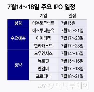 화학품 제조업체 아이티켐은 17일부터 23일까지 기관 투자자의 평가를 받는다. 희망공모가는 1만4500~1만6100원이다. 같은 기간 자동차 전장부품 업체인 한라캐스트도 수요예측을 진행한다. 희망공모가는 5100~5800원이다.