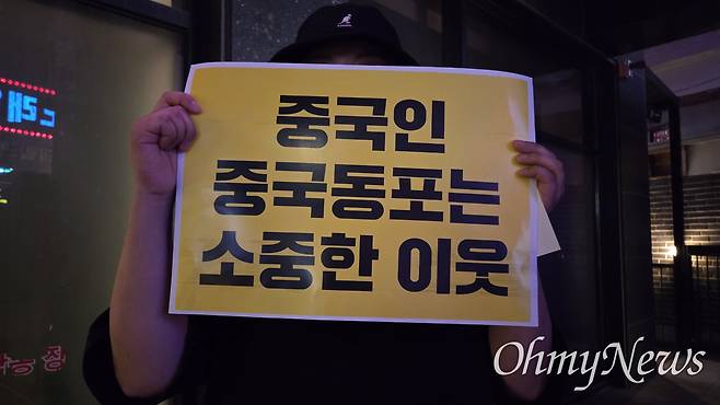 | ▲ 11일 오후 7시 30분 대림역 인근에서는 여러 시민단체들이 "극우세력 물러가고 중국 동포도 우리 이웃"이라고 집회를 열었다. 집회에 참여한 중국인 유학생 지유(29)씨는 "손팻말에 적힌 '중국동포는 소중한 이웃'이란 말이 힐링됐다"고 말했다. |