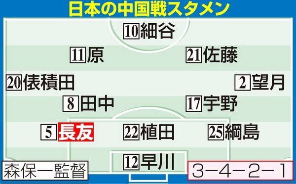 이날 모리야스 하지메 감독은 지난 홍콩과의 1차전 라인업 당시 선발로 뛰었던 11명을 모두 바꿨다. 무려 5명의 선수가 중국전을 통해 데뷔했고 '백전노장' 나가토모 유토가 스타팅 멤버로 나섰다.