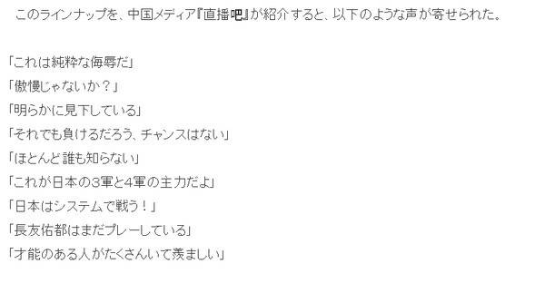이에 중국 팬들은 예민하게 반응했다. "이건 순전 모욕이다", "오만한 선택이다", "명백하게 얕잡아 보고 있다", "거의 아무도 모르는 선수들이다", "일본의 3군, 4군 선수들이 경기에 나섰다" 등 주로 날 선 비판이 제기됐다.