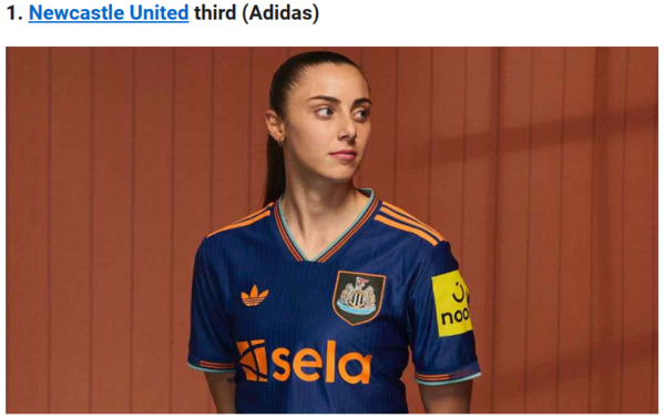 반면 뉴캐슬 유나이티드가 호성적을 거뒀다. 홈 유니폼이 3위를 차지한 데 이어 서드 유니폼은 영예의 1위를 거뒀다. 각각 “뉴캐슬의 상징인 검정색과 흰색 스트라이프는 흐릿한 경계선과 생동감 있는 파란색 트리밍 덕분에 한층 더 세련되게 표현됐다”, “특정 세대의 팬들에게 향수를 자극한다. 색 조합은 여전히 훌륭하며, 복고풍 트레포일 로고가 멋스러움을 더해준다”라고 설명했다.