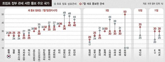 트럼프 대통령은 이날 소셜미디어 트루스소셜에 우르줄라 폰데어라이엔 유럽연합 집행위원장과 클라우디아 셰인바움 멕시코 대통령을 각각 수신자로 한 ‘관세 서한’을 공개하며 오는 8월 1일부터 30%의 관세를 부과하겠다고 밝혔다. 멕시코는 5% 포인트 인상된 수치이며, 유럽연합은 당초 발표한 20%에서 10% 포인트 올랐으며, 중간에 올렸던 50%와 비교하면 20% 포인트 내린 수치다. 트럼프 대통령은 지난 7일 일본·한국을 시작으로 이날까지 총 25개 국가에 관세 서한을 발송했다. 이중 일본·캐나다·멕시코·유럽연합 등 주요 교역국에는 당초보다 인상된 관세율을 통보했다.