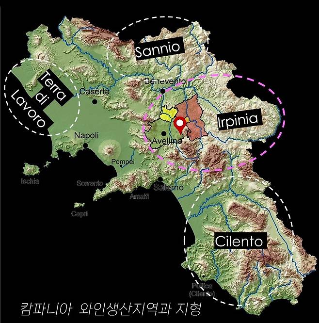 캄파냐는 고대 로마시대때부터 와인 생산의 중심지였으며 지금도 다양한 토착 품종과 화산 토양 덕분에 개성이 뚜렷한 고품질 와인으로 주목받는 지역입니다. 캄파니아 동쪽 내륙 아벨리노(Avellino) 지방의 와인산지 이르피니아(Irpinia)에는 캄파냐 3대 DOCG(Denominazione di Origine Controllata Garantita·원산지통제명칭보증)가 몰려있습니다. 레드 와인 산지인 타우라시 DOCG, 화이트 와인 산지 피아노 디 아벨리노 DOCG(Fiano di Avellino DOCG)와 그레코 디 투포 DOCG(Greco di Tufo DOCG)입니다. 이중 타우라시는 해발고도 350~700m의 아펜니노 산맥에 포도밭이 있습니다. 토양은 전형적인 화산토양입니다. 특히 타우라시에서 재배되는 알리아니코는 ‘남부의 바롤로(Barolo del Sud)’라는 별명으로 불릴 정도로 장기 숙성잠재력이 뛰어난 와인으로 손꼽힙니다.