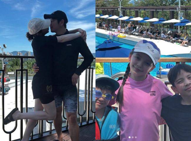 또 다른 사진 속에는 세 자녀가 나란히 선 채 물놀이를 즐기고 있다. 첫째 나은이는 핑크색 래시가드를 입고 여전히 사랑스러운 미소를 짓고 있고, 건후와 진우 역시 물안경을 착용한 채 수영복 차림으로 활기찬 에너지를 뽐냈다.
