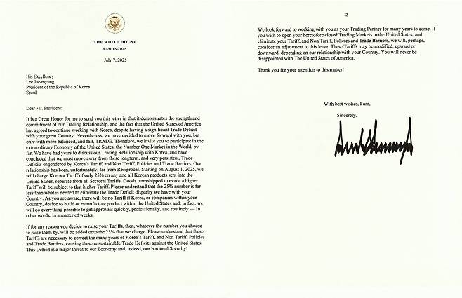 | ▲ 7일(현지 시각) 도널드 트럼프 미국 대통령이 이재명 대통령에게 보낸 서한에 8월 1일부터 한국에 25% 상호관세를 부과하겠다는 내용이 담겨 있다. |