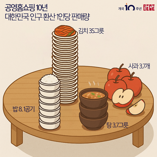특히 지난 10년간 국민 먹거리와 생활필수품에서 대규모 판매 실적을 기록했다. 쌀, 김치, 탕, 사과, 의류, 휴지 등 주요 상품의 누적 판매량이 대한민국 인구 전체가 체감할 수 있는 수준인 것으로 나타났다.