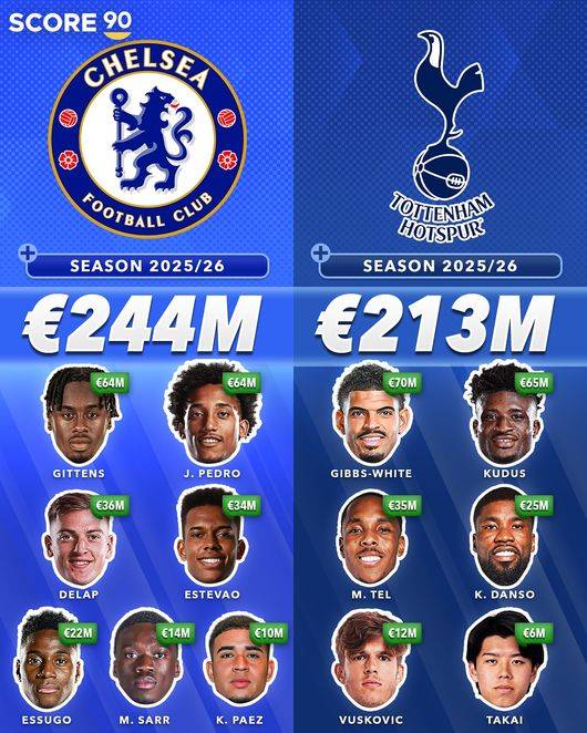 축구 콘텐츠를 제작하는 '스코어 90'은 12일(한국시간) 소셜 미디어를 통해 프리미어리그 구단들의 여름 이적시장 지출 현황을 전했다.