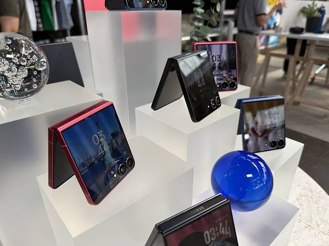 [삼성전자는 9일(현지시간) 뉴욕 브루클린 두갈 그린하우스에서 열린 신제품 공개 행사 '갤럭시 언팩 2025'에서 신형 폴더블 스마트폰 갤럭시 Z 폴드7 및 플립7를 전 세계에 소개했다. 사진은 전시된 플립7 모습. (뉴욕=연합뉴스)]