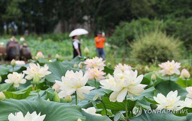 (양평=연합뉴스) 홍기원 기자 = 13일 연꽃문화제가 열리고 있는 경기도 양평군 세미원을 찾은 시민들이 활짝 핀 연꽃을 감상하고 있다. 2025.7.13