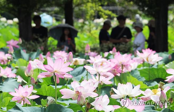 (양평=연합뉴스) 홍기원 기자 = 13일 연꽃문화제가 열리고 있는 경기도 양평군 세미원을 찾은 시민들이 활짝 핀 연꽃을 감상하고 있다. 2025.7.13