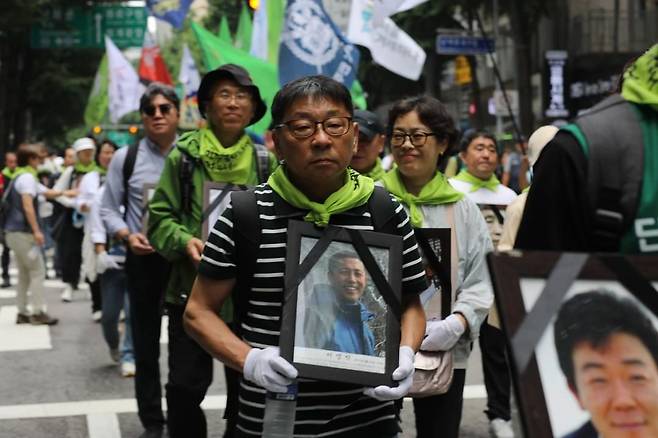 | ▲ 2024년 6월 8일 33회 민족민주열사추모제 서명식 열사 영정들고 행진하는 모습 |