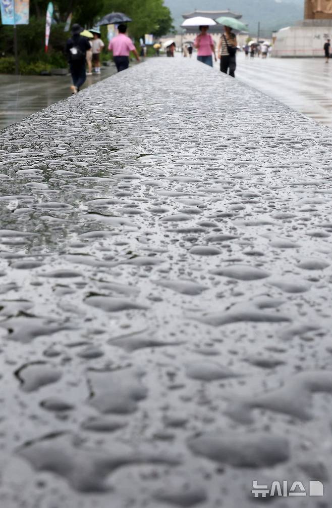 [서울=뉴시스] 배훈식 기자 = 무더위를 식혀주는 비가 내린 13일 오후 서울 종로구 광화문광장에서 우산을 쓴 시민들이 발걸음을 옮기고 있다. 2025.07.13. dahora83@newsis.com