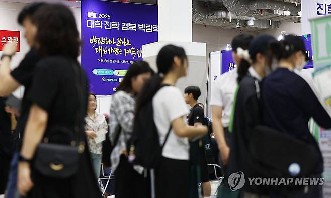 (구미=연합뉴스) 김현태 기자 = 13일 경북 구미시 구미코에서 열린 2026학년도 대학 진학 경북박람회에서 수험생과 학부모 등이 행사장을 살펴보고 있다. 경상북도교육청 연구원이 주최한 이번 행사에는 전국 64개 대학이 부스를 운영했다. 고등학교 1, 2학년생을 위한 2027, 2028 대입전형의 이해 특강과 16개 학과의 대학생 멘토링 등도 진행됐다. 2025.7.13