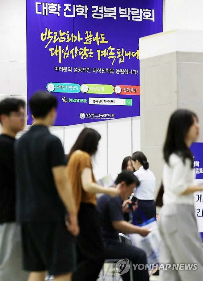 (구미=연합뉴스) 김현태 기자 = 13일 경북 구미시 구미코에서 열린 2026학년도 대학 진학 경북박람회에서 수험생과 학부모 등이 행사장을 살펴보고 있다. 경상북도교육청 연구원이 주최한 이번 행사에는 전국 64개 대학이 부스를 운영했다. 고등학교 1, 2학년생을 위한 2027, 2028 대입전형의 이해 특강과 16개 학과의 대학생 멘토링 등도 진행됐다. 2025.7.13
