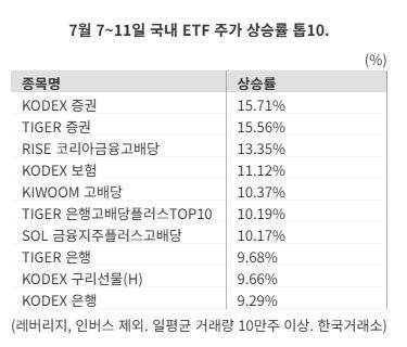 상위권을 차지한 종목은 증권, 은행 등 금융 관련 종목들이다. 최근 금융사들은 2·4분기 실적 호조와 주주환원 확대 기대감 등으로 큰 폭의 상승률을 보이고 있다. 같은 기간 상승률 상위 10개 종목 중 9위에 이름을 올린 'KODEX 구리선물H(9.66%)를 제외한 9개 종목이 모두 금융 관련 ETF다.