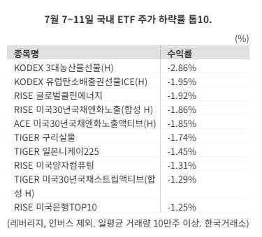 반면 농산물 ETF, 유럽탄소배출 ETF 등은 하락세를 보였다. 'KODEX 3대농산물선물(-2.86%)', 'KODEX 유럽탄소배출권선물ICE(-1.95%), 'RISE 글로벌클린에너지(-1.86%) 순으로 하락률 상위권을 형성했다.