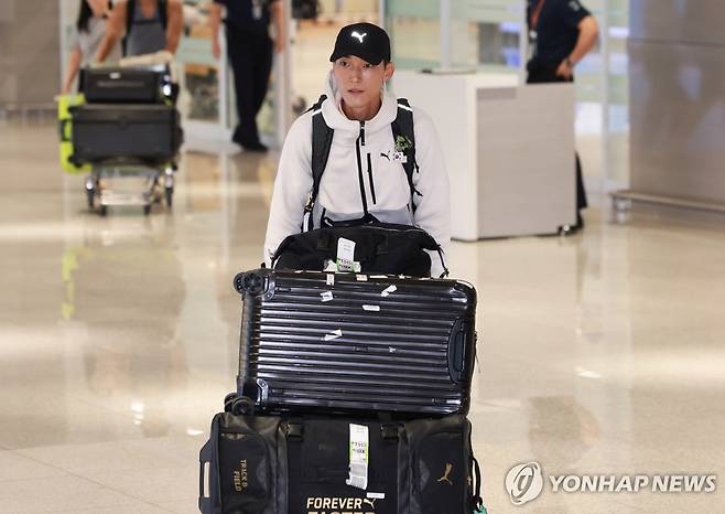 (영종도=연합뉴스) 신현우 기자 = 모나코에서 열린 2025 세계육상연맹 다이아몬드리그 남자 높이뛰기에서 우승하며 2025시즌 국제대회 7연승을 이어간 우상혁이 13일 인천국제공항 제2여객터미널을 통해 귀국하고 있다.