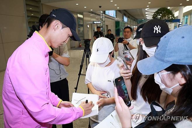 (영종도=연합뉴스) 신현우 기자 = 모나코에서 열린 2025 세계육상연맹 다이아몬드리그 남자 높이뛰기에서 우승하며 2025시즌 국제대회 7연승을 이어간 우상혁이 13일 인천국제공항 제2여객터미널을 통해 귀국, 팬들에게 사인해주고 있다.