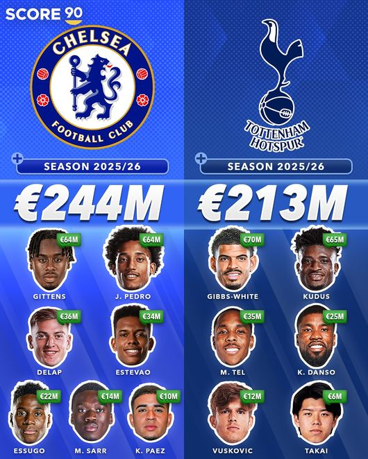 토트넘은 공격적인 영입으로 시장에서 존재감을 드러내고 있다. 우선 임대 신분이었던 마티스 텔과 케빈 단소를 각각 3500만 유로(564억 원), 2500만 유로(403억 원)에 완전 영입했다. 미래 자원 확보도 병행했다. 2004년생 일본 센터백 다카이 고타와 2007년생 크로아티아 수비수 루카 부슈코비치를 각각 1200만 유로(193억 원), 600만 유로(97억 원)에 데려왔다. 두 선수는 중장기적 관점에서 이뤄진 영입으로 평가된다.