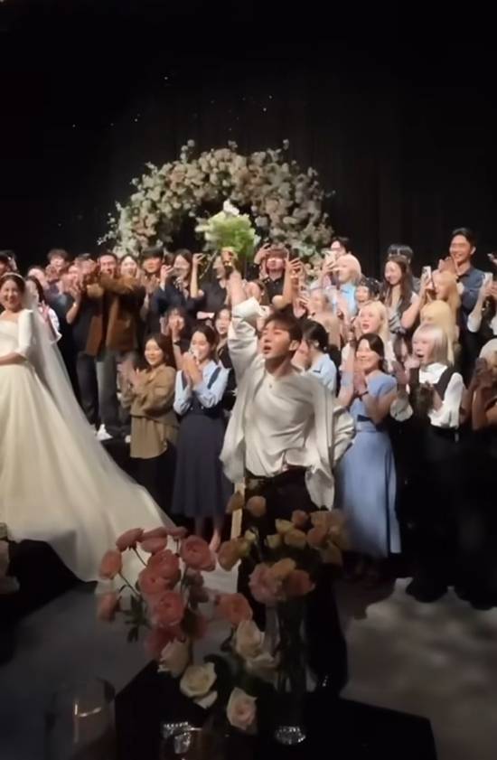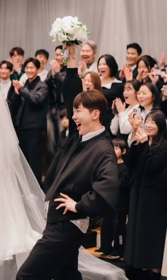 영상 속 조권은 결혼식 하객들 사이에서 다양한 포즈로 부케를 정확히 캐치해냈다.