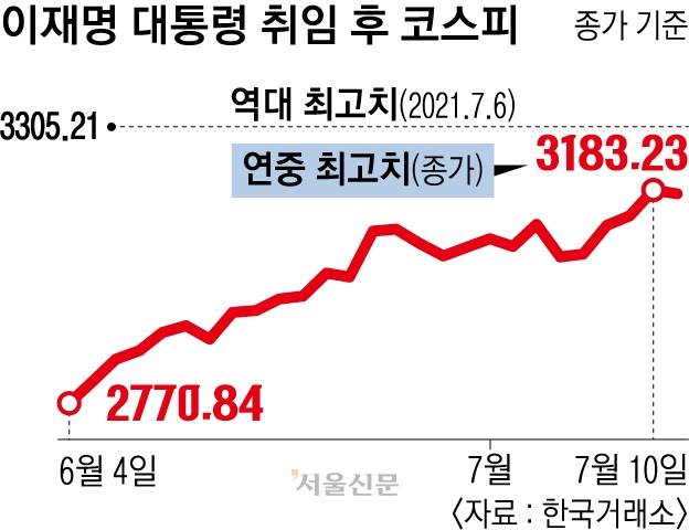 13일 한국거래소에 따르면 코스피는 지난 10일 3183.23으로 종가 기준 연중 최고치를 기록한 뒤 11일엔 장중 3216.69까지 오르며 심리적 저항선인 3200선도 돌파했으나 전날보다 0.23% 내린 3175.77에 마감했다. 종가 기준 역대 최고치는 지난 2021년 7월 6일 3305.21로 이를 경신하기까지 불과 130포인트 정도만을 남겨두고 있다.