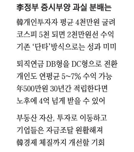 이 대통령의 발언은 돈의 흐름을 부동산에서 주식으로 바꾸자는 취지로 풀이됩니다. 기업가치 상승, 국민 자산 증식을 상징하는 지표이기 때문입니다.