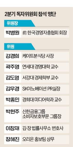 이날 회의는 박병원 한경 독자위원회 위원장(전 한국경영자총협회 회장)이 이끌었다. 김도영(서강대 경제학부 교수), 장혜진(오리온 홍보팀 상무), 곽주영(연세대 경영대 교수), 강경희(케이트분식당 사장), 박종민(경희대 미디어학과 교수), 이창재(김앤장 법률사무소 변호사), 박현주(신한금융그룹 소비자보호부문 그룹장), 김우경(SK이노베이션 PR 실장) 위원이 참석했다.