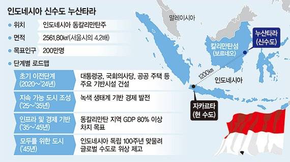 인도네시아 정부는 2019년 자카르타에서 1200km 떨어진 칼리만탄섬(보르네오섬)의 발릭파판 지역에 새롭게 수도를 조성하기로 결정하고 사업을 추진해왔다. 누산타라 신수도는 서울의 4배 규모에 달하는 거대 도시 프로젝트로 총사업비만 40조원이 넘는다. 2028년 수도 이전을 목표로 2024년 1단계 개발을 마무리하고 핵심 정치 기능의 이전을 시작했다.