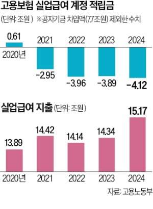 실업급여 상·하한액이 모두 오르다보니 실업급여 재원인 고용보험기금 재정에도 타격이 불가피하다. 올해 5월 기준 고용보험기금의 ‘실업급여 계정’ 수지는 1584억원 적자다. 적립금은 3조4357억원이지만 공공자금관리기금 차입금을 제외하면 4조2851억원이나 마이너스다.