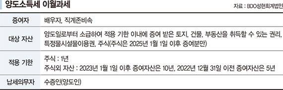 이월과세 적용 기간은 각기 다르다. 주식은 증여 뒤 1년 내에 양도한 경우까지 적용된다. 주식을 제외한 자산은 2023년 1월 1일 이후 증여받은 경우에는 10년, 그전에 증여받은 자산에는 5년을 적용한다. 예컨대 부동산을 2023년 1월에 증여받았다면 2033년 1월까지 이월과세 적용 대상이 되는 것이다.