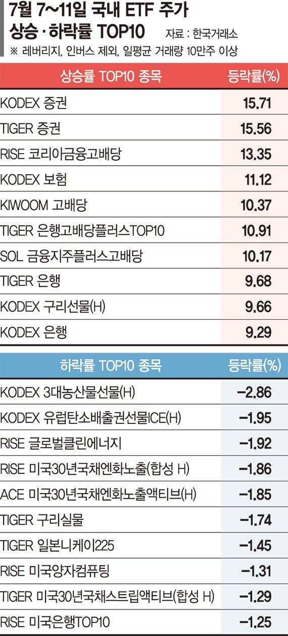 상위권을 차지한 종목은 증권, 은행 등 금융 관련 종목들이다. 최근 금융사들은 2·4분기 실적 호조와 주주환원 확대 기대감 등으로 큰 폭의 상승률을 보이고 있다. 같은 기간 상승률 상위 10개 종목 중 9위에 이름을 올린 'KODEX 구리선물H(9.66%)를 제외한 9개 종목이 모두 금융 관련 ETF다.