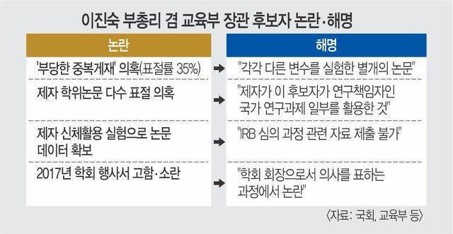 이 후보자는 제자의 석·박사 학위논문을 가로챘다는 의혹도 부인한 것으로 알려졌다. 해당 논문은 이 후보자가 연구·논문 작성을 주도했고, 제자가 이 후보자의 국가 연구과제 일부를 활용해 학위논문을 썼다는 설명이다. 하지만 이 후보자 해명이 맞다면 제자들의 학위가 취소될 수 있다. 한 국립대 교수는 “제자가 자신이 주도하지도 않은 연구로 논문을 써서 학위를 받았다고 해명한 셈”이라고 지적했다.